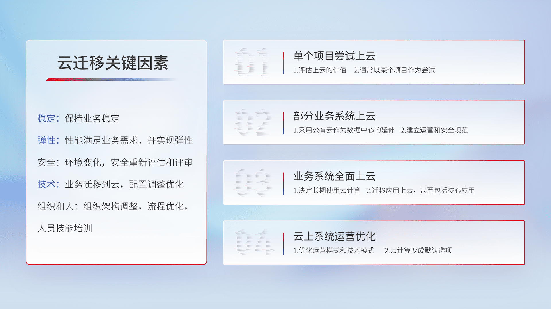 结合实际业务,,,,从规划设计、、、、云平台选型、、、、云原生改造、、、、数据迁移、、集成交付,,,,迁移全过程为客户识别最佳上云路径,,,做好风险识别管理,,设计网络架构、、身份权限、、安全审计合规、、、操作审计、、、日志审计、、、监控告警策略、、、、多站点容灾设计等,,对云上基础设施进行整体规划,,提升IT治理水平,,,,以满足弹性、、、高可用、、高性能的需求。。。
