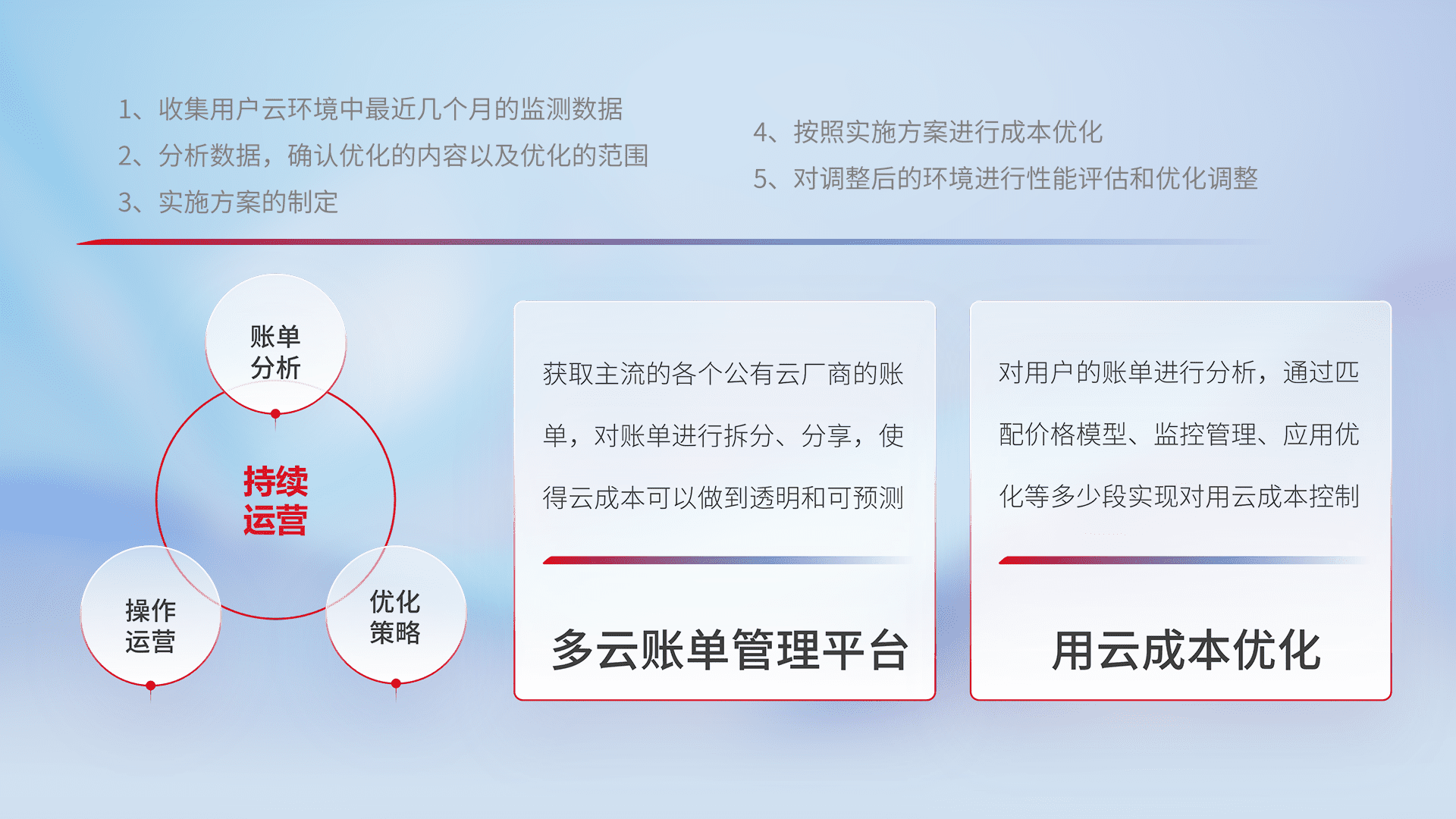通过多云纳管,,,以统一的资源数据模型把客户的云资源进行抽象和封装,,,进而实现对多云资源的统一操作,,,,保障云资源管理的可靠性、、、、稳定性与可用性。。。量身定制化运维内容,,,配置、、、开发运维、、补丁管理、、、备份、、、监控、、认证和访问管理、、、、审计和日常巡检等,,保障在用云过程中的可靠度,,,,稳定度以及高可用率。。。